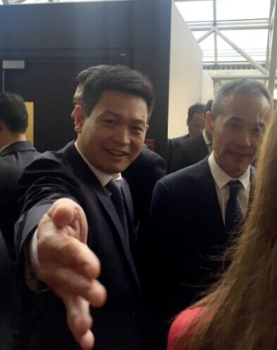 外交部部长王毅(左二)与振威展览董事长张学山(右一)在会场外亲切交谈