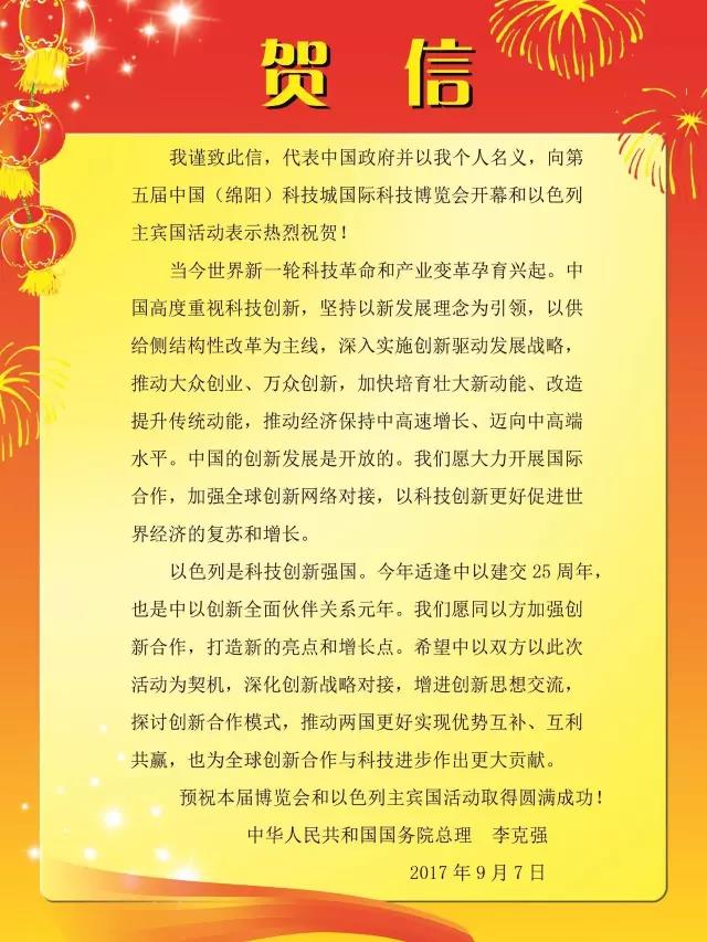 绵阳科博会开幕!李克强、内塔尼亚胡发来贺信!