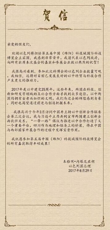 中华人民共和国总理李克强、以色列总理本雅明•内塔尼亚胡发来贺信。“希望中以双方以此活动为契机,推动两国更好实现优势互补、互利共赢,也为全球创新合作与科技进步作出更大贡献,并预祝本届科博会取得圆满成功”克强总理在贺信中殷殷嘱托。