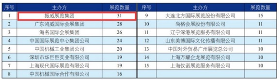 《中国展览经济发展报告(2018)》显示,2018年共有15家国内组展企业办展数量超过10个,有9家内地组展企业办展数量超过15个。其中,振威展览集团共举办 31 个展览,办展数量在国内组展企业中位居首位。