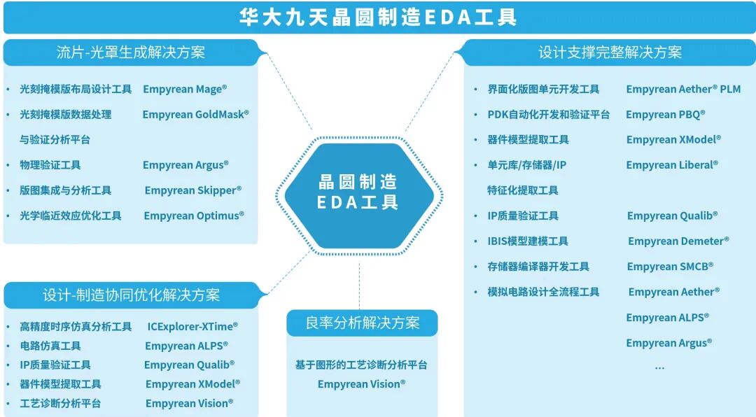 包括原有工具器件模型提取工具、IBIS模型建模工具、光刻掩模版布局设计工具、存储器编译器开发工具、单元库特征化提取工具、存储器电路特征化提取工具、混合信号电路模块特征化提取工具、单元库/IP 质量验证工具、版图集成与分析工具以及模拟电路设计全流程EDA工具等以及新发布光刻掩膜版数据查看和分析工具、参数化版图单元开发工具、界面化版图单元开发工具、测试芯片版图自动化生成工具、PDK自动化开发和验证平台等工具,为晶圆制造厂提供了重要的技术支撑。