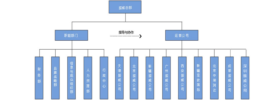振威会展实施北京、天津双总部制,旗下拥有北京振威、天津振威、广州振威、新疆振威、成都振威、海南振威、青岛振威、深圳振威、郑州振威及北京中装润达,成立了3家混合所有制公司。深圳国资委主管的深投控国信证券是振威国际会展集团的第六大股东。2015年,经时任中央政治局委员、新疆维吾尔自治区党委书记张春贤,时任商务部副部长、党组副书记钟山批示,经新疆维吾尔自治区人民政府批准,振威国际会展集团与新疆国际博览事务局成立国内首家混合所有制会展公司——新疆亚欧国际博览有限公司。2019年,经青岛西海岸新区批准,振威国际会展集团与青岛黄发集团成立混合所有制会展公司——青岛东亚国际博览有限公司。2021年,振威国际会展集团与广东潭洲国际会展有限责任公司成立混合所有制会展公司——广东潭洲振威会展有限公司。