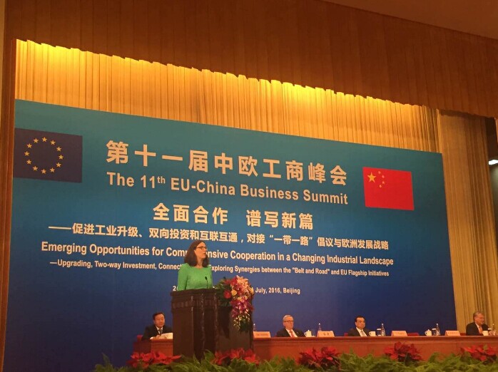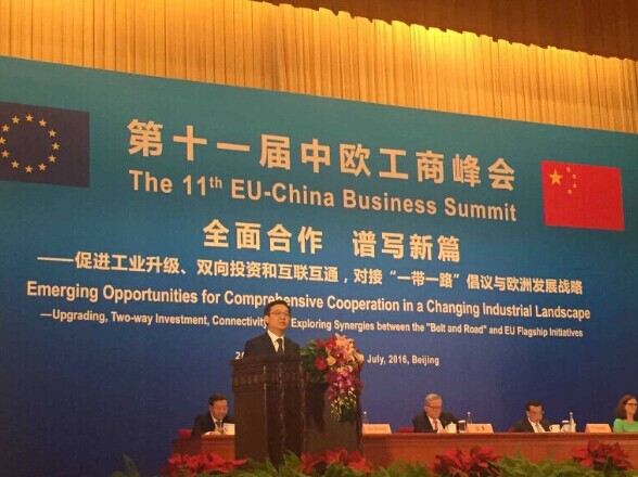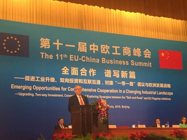 第十一届中欧工商峰会由中国商务部、欧盟委员会主办,中国国际贸易促进委员会、中国欧盟商会等机构联合承办。大会主题为:全面合作谱新篇——促进工业升级、双向投资和互联互通,对接“一带一路”倡议与欧洲发展战略。会议由中国贸促会会长姜增伟主持,中国欧盟商会主席伍德克、中国商务部部长高虎城、欧盟贸易委员马尔姆斯特伦分别致辞,欧盟委员会主席容克发表演讲。国家发改委主任徐绍史、工业和信息化部部长苗圩等相关部委领导到会。同时,由中国机械工业集团有限公司董事长任洪斌,欧洲雇主协会主席、意大利埃尼石油集团董事长马切卡利亚,中国建筑材料集团有限公司董事长宋志平,罗兰贝格国际管理咨询有限公司首席执行官常博逸,TCL集团股份有限公司总裁薄连明,振威展览股份董事长张学山等企业家组成的“豪华”中外参会阵容,亦颇受外界瞩目。会上,与会人员围绕“政策沟通——共同迎接新工业革命”、“资金融通——促进双向融资”和“设施联通——深化交通数字合作”三个分组议题展开了深入探讨。