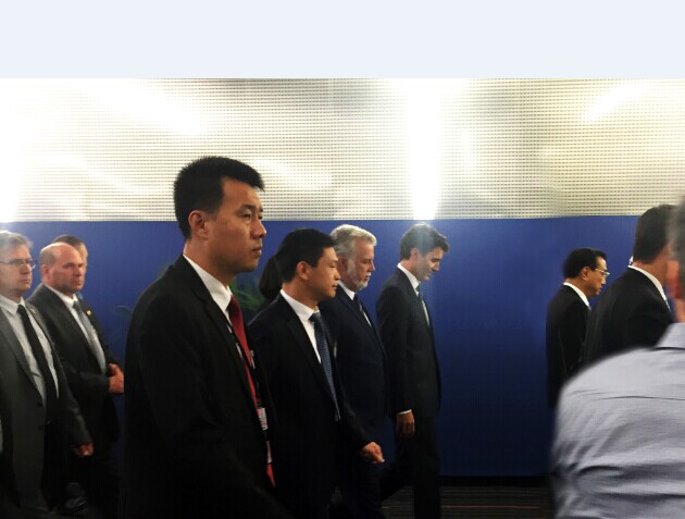 李克强总理(前排左一)、特鲁多总理(二排左一)与企业家们(振威展览董事长张学山,二排左三)一起步入论坛会场
