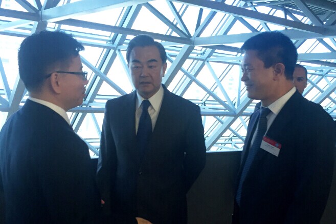 外交部部长王毅(左二)与振威展览董事长张学山(右一)在会场外亲切交谈