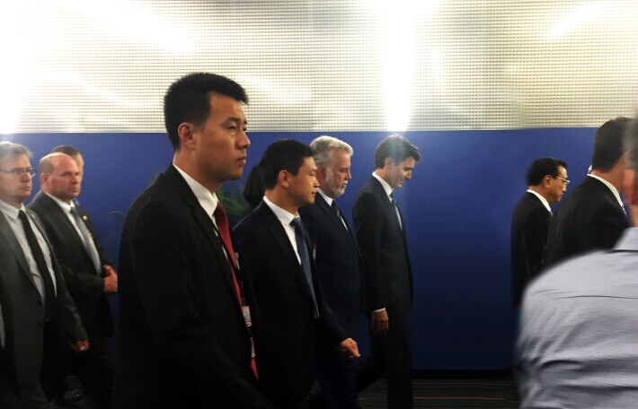 图为李克强总理(前排左一)、特鲁多总理(二排左一)与张学山(二排左三)等企业家一起步入第六届中国—加拿大经贸合作论坛会场。
