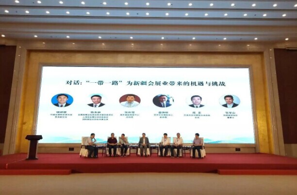 “一带一路”为新疆会展业带来的机遇与挑战对话嘉宾:中国会展经济研究会常务副会长储祥银(左二),全国会展业标准化技术委员会主任、上海市会展行业协会会长、国际展览业协会名誉主席陈先进(左三),南京国际博览中心总经理张庆瑄(左四),苏州文化博览中心副总裁查炜琮(右三),大连市会议展览行业协会会长陈幸(右二),振威展览股份董事长张学山(右一)