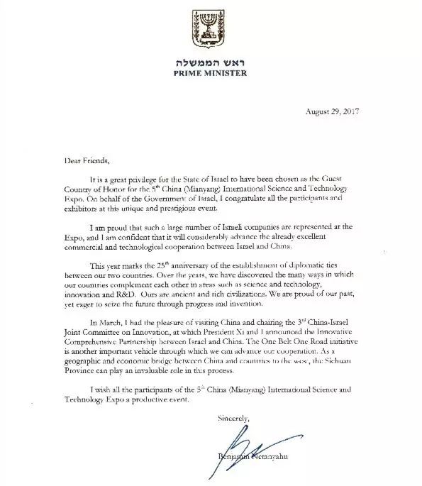 中华人民共和国总理李克强、以色列总理本雅明•内塔尼亚胡发来贺信。“希望中以双方以此活动为契机,推动两国更好实现优势互补、互利共赢,也为全球创新合作与科技进步作出更大贡献,并预祝本届科博会取得圆满成功”克强总理在贺信中殷殷嘱托。