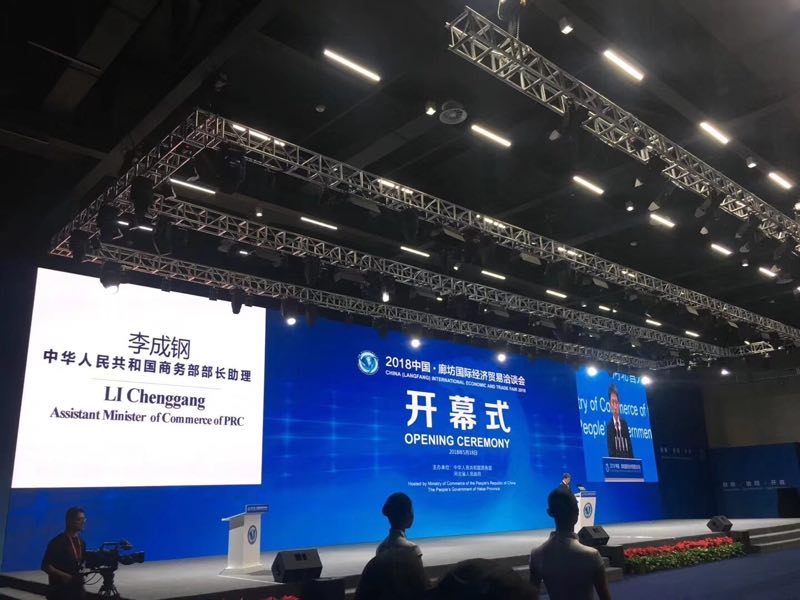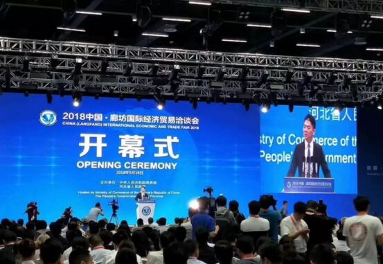 5月18日上午,由商务部、河北省人民政府主办,商务部投资促进事务局、河北省商务厅、廊坊市人民政府承办的2018中国•廊坊国际经济贸易洽谈会(简称“5•18”经洽会)在廊坊隆重开幕,来自全球50多个国家和地区的1422家企业机构、2000多位嘉宾相聚廊坊,共享时代新机遇,共话合作新愿景,共赢美好新未来。