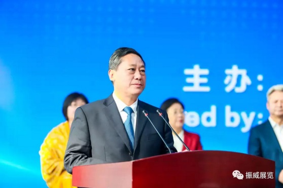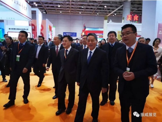 振威展览股份副总裁贾鹏洲和项目负责人马玉柱陪同中国科学技术部原党组成员、秘书长、国际欧亚科学院院士张景安,山东省商务厅副厅长王洪平,中共烟台市委书记张术平等领导参观展会现场。