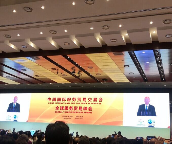 2019年5月28日-6月1日,中国国际服务贸易交易会在京盛大开幕。28日上午,全球服务贸易峰会在北京国家会议中心召开。2019年中国国际服务贸易交易会受到国家主席习近平的高度重视,专程发来贺信并指出:中国愿同各国深化服务贸易投资合作,促进贸易和投资自由化、便利化,推动经济全球化朝着更加开放、包容、普惠、平衡、共赢的方向发展。