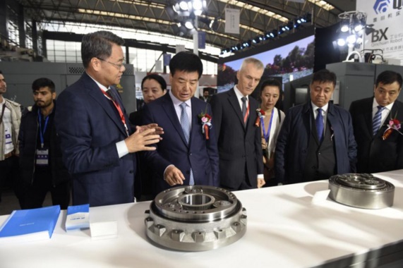 白俄罗斯驻华大使馆公使衔参赞尤里·罗布科(中)、陕西省人民政府副秘书长兰建文(右二)、宝鸡市市长惠进才(左二)、宝鸡市副市长王宁岗(右一)参观秦川集团展台