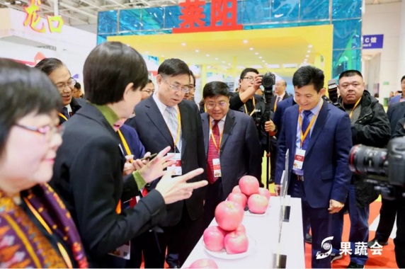 振威展览股份董事长张学山(右一)陪同烟台市委常委、常务副市长王中(右三)参观展会并点赞烟台苹果