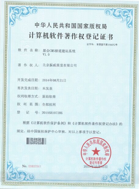 计算机软件著作权登记证书(展会CMS极速建站系统V1.0)