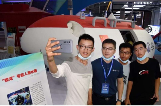 观众在展会上与“蛟龙”号潜航员付文韬(左二)合影