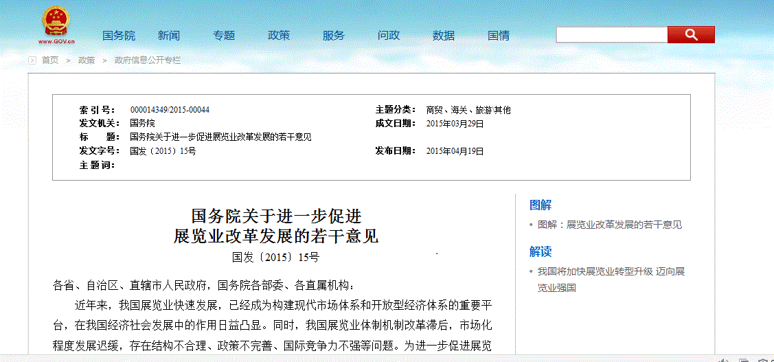 国务院关于进一步促进展览业改革发展的若干意见国发〔2015〕15号 各省、自治区、直辖市人民政府,国务院各部委、各直属机构: 近年来,我国展览业快速发展,已经成为构建现代市场