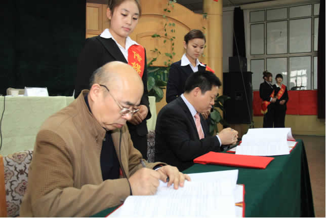 全体学生对校、企领导人的讲话报以热烈的掌声,掌声中,会展1011班的学生代表宣读了《校企合作协议》,职业大学党继农校长、新疆振威张学林总经理交换签署了协议。