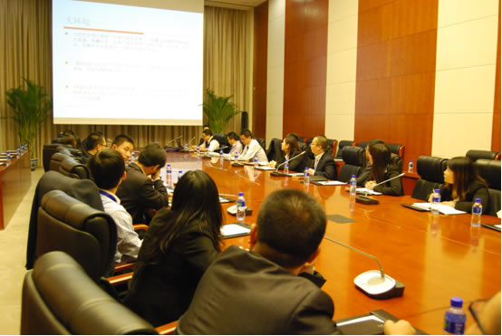 图注:北京振威上海石化展经理典伟(左二)在年会沙龙中同全体员工现场交流