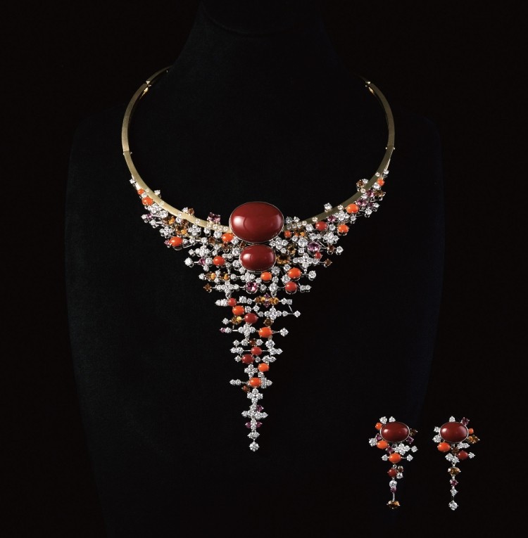 在旭日咋现于地平线的那一霎那,燃烧般的太阳在海面投映出另一个自己。材料:血赤珊瑚、粉红珊瑚、白金、黄水晶、粉红色电气石项链、耳环。