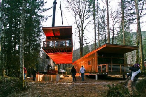 以集装箱为基本模块,采用制造模式,在工厂内以流水线制造完成各模块的结构建造和内部装修后再运输到工程现场,按不同的用途与功能快速组合成风格各异的房屋建筑。