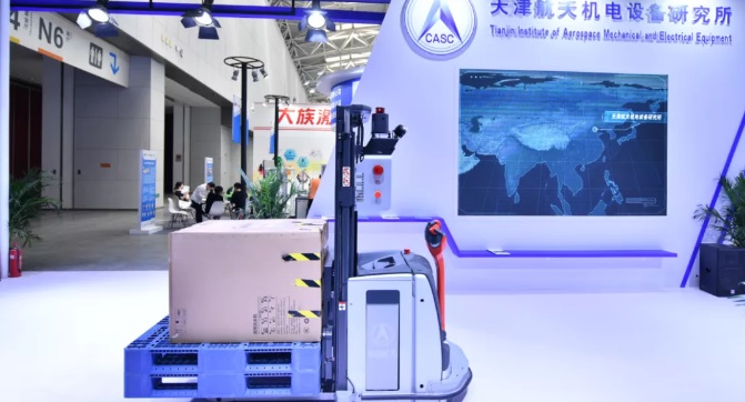 天津航天机电设备研究所本次展出的智能激光导航叉车受到了现场来自智慧物流领域买家的关注。本款智能激光导航叉车通过激光扫描与算法获取叉车在环境中的位置,再由负责路径规划的软件规划出较优路径,实现精确定位与稳定行走;由末端反射板辅助定位,实现叉车在工位中精准叉取与放置托盘。有了这种较先进的混合激光导航技术,完全实现让叉车自动化驾驶与作业,是未来智能运输、智慧仓储系统的重要发展方向。