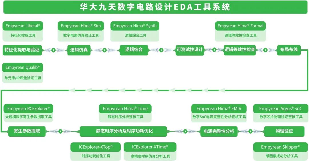 为数字电路设计的部分环节提供了关键解决方案,包括单元库特征化提取工具、存储器电路特征化提取工具、混合信号电路模块特征化提取工具、单元库/IP 质量验证工具、逻辑综合工具、时序功耗优化工具、高精度时序仿真分析工具、时钟质量检视与分析工具、版图集成与分析工具、数字物理验证和数字寄生参数提取工具、逻辑综合工具、基于GPU平台的单元库特征化提取工具等。