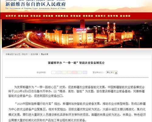 新疆自治区政府网:新疆将举办“一带一路”智能农业装备博览会