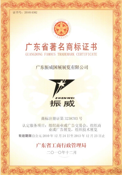 日前,经广东省工商行政管理局认定,广东振威荣获“广东省著名商标”的称号,这标志着公司的品牌建设再迈向一个新台阶。 广东省著名商标证书 据悉,广东省著名商